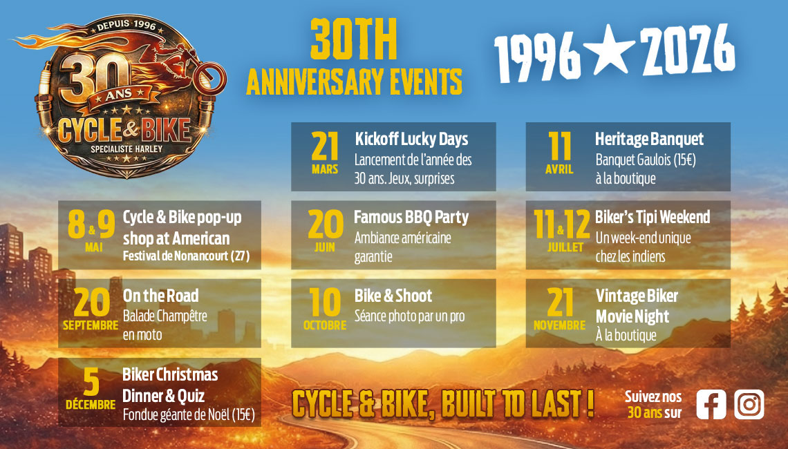 Depuis 1996, Cycle & Bike vit au rythme du V‑Twin, des virées entre amis et de la culture Harley‑Davidson. Trente ans que notre boutique rassemble passionnés, curieux, riders du dimanche ou bikers pur jus autour d’une même envie : rouler, partager et faire vivre un style de vie unique.